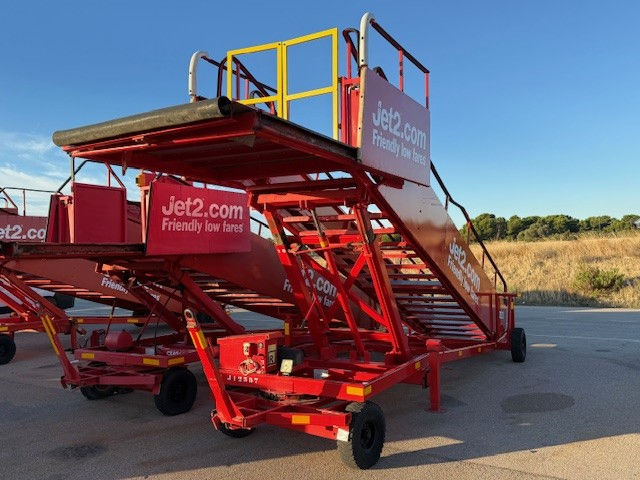The Owen Holland TPS 1941 is a towable passenger stair designed to service a wide range of aircraft with door‑sill heights from 1.90 m up to 4.10 m. Built with a robust parallelogram structure, aluminium anti‑slip treads and a comfortable top platform, it ensures safe boarding and deboarding for passengers. This unit has been refurbished in 2019, 2020 and 2022 and is offered with red paint (stickers will be removed before delivery). A new white paint finish is available upon request for an additional charge.